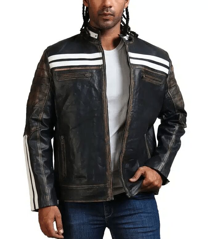 Men’s Black Café Racer Leather Biker Jacket with White Straps – Sleek Moto Edge